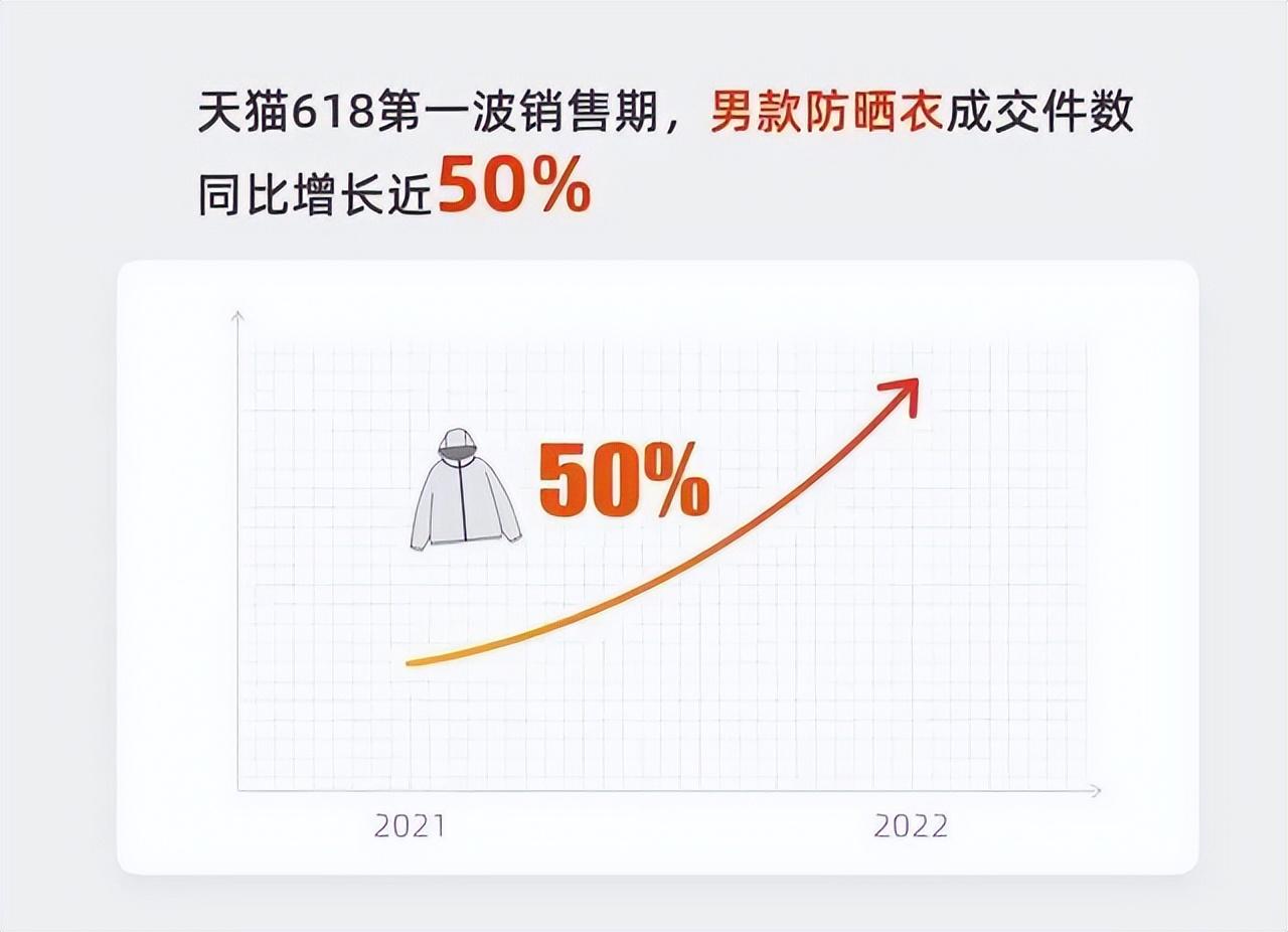 與此同時,男生也開始注重防曬。數(shù)據(jù)顯示,2022年天貓“6·18”期間,男款防曬衣供給和加購顯著增長,成為戶外服飾中銷售火的商品,成交件數(shù)同比增長近50%。