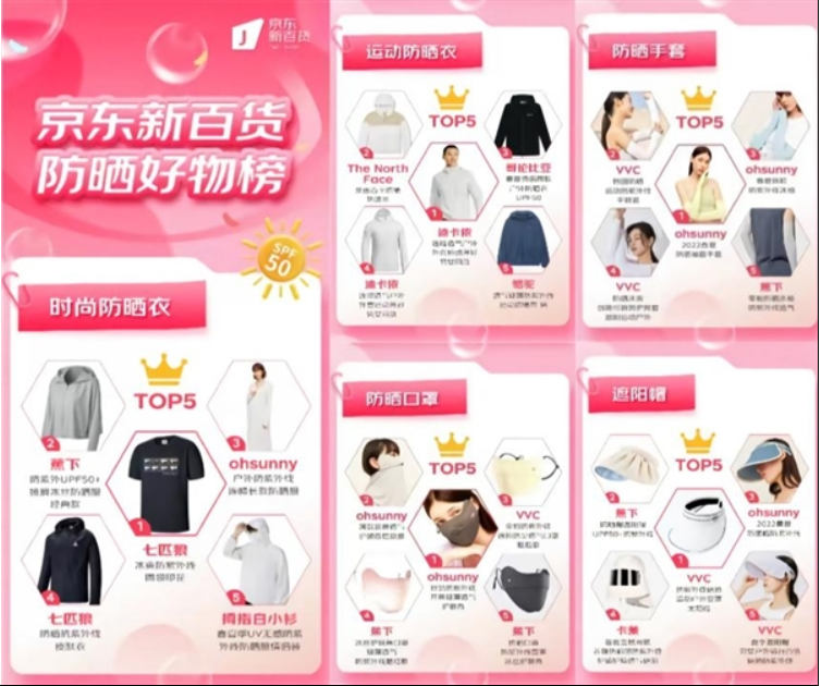 京東新百貨服飾的防曬衣品類成交額同比增長6.85倍,防曬口罩成交額環(huán)比增長;蕉下品牌成交額同比增長10倍,ohsunny爆款防曬衣成交額同比增長3倍,蕉內(nèi)涼皮防曬衣上線1小時售罄。