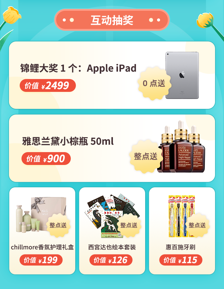4 個小時的直播里,我們?yōu)榇蠹覝蕚淞?strong>iPad、小棕瓶、宮西達也恐龍系列繪本(全 7 冊)、惠百施牙刷、chillmore 香氛護理禮盒等又實用的獎品。