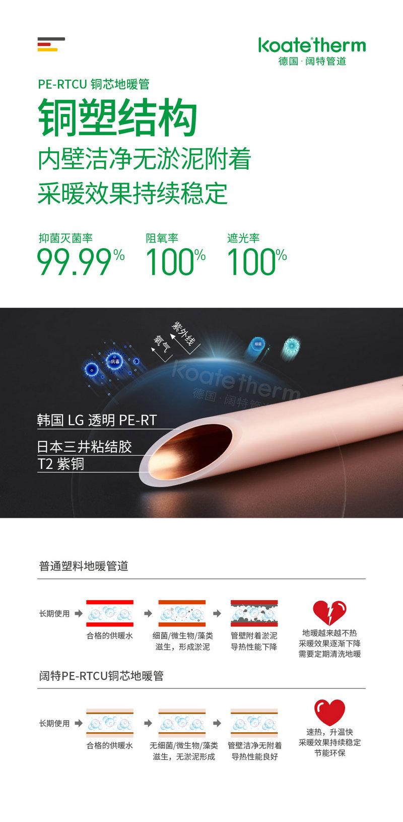 德國闊特koate?therm PE-RTCU銅芯地暖管道,T2紫銅內(nèi)層抑菌滅菌率99.99%,而且終生有;阻氧率,遮光率,徹底杜絕細菌、微生物、藻類滋生。管道內(nèi)部無淤泥滋生,導熱果更持久,更節(jié)能環(huán)保。