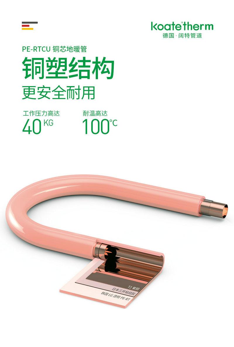 德國闊特koate?therm PE-RTCU銅芯地暖管道,工作壓力高達40Kg,工作溫度高達100℃,內(nèi)層采用T2紫銅(銅含量99.99%)。