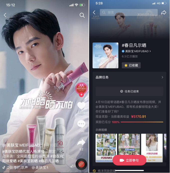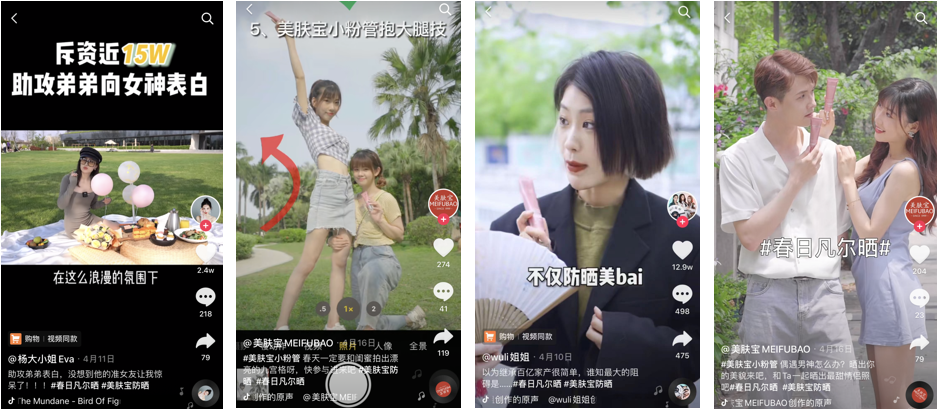 美膚寶的做法是,一方面通過與眾多劇情/美妝種草KOL合作,通過多維度演繹美膚寶小粉管核心利益吸引用戶興趣,貼合抖音平臺(tái)“貨找人”的平臺(tái)特性;另一方面,在抖音端發(fā)布全民任務(wù)#春日凡爾曬#,利用KOL引發(fā)全民參與,產(chǎn)生大量UGC內(nèi)容,將營銷覆蓋范圍大化。