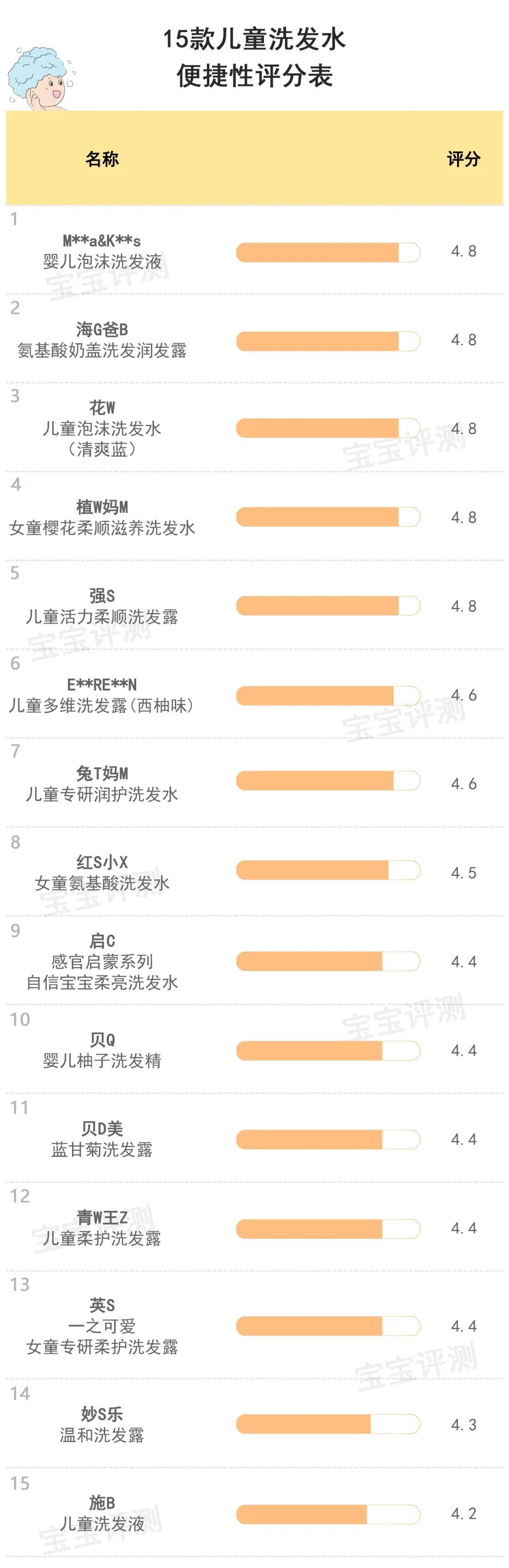 綜合以上分析,15款兒童洗發(fā)水笨爸爸給出的便捷性評分情況如下: