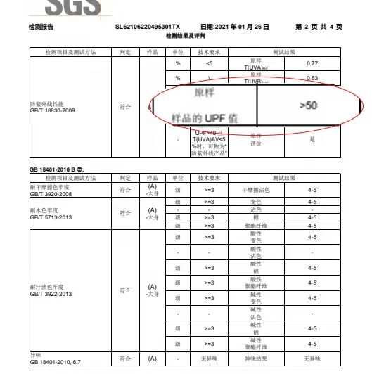 經(jīng)過檢測,紫外線防護系數(shù)>50(即50+),符合《防紫外線性能的評定》的規(guī)定。