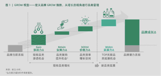 我注意到波士頓和天貓大快消今年提出了一個(gè)“Grow”增長模型。Grow是由4個(gè)英文單詞組成,分別是:Gain(指現(xiàn)有品類滲透機(jī)會(huì))、Retain(品類復(fù)購提升機(jī)會(huì))、bOOst(品類貨單增長空間)和Widen(關(guān)聯(lián)品類延展機(jī)會(huì))。