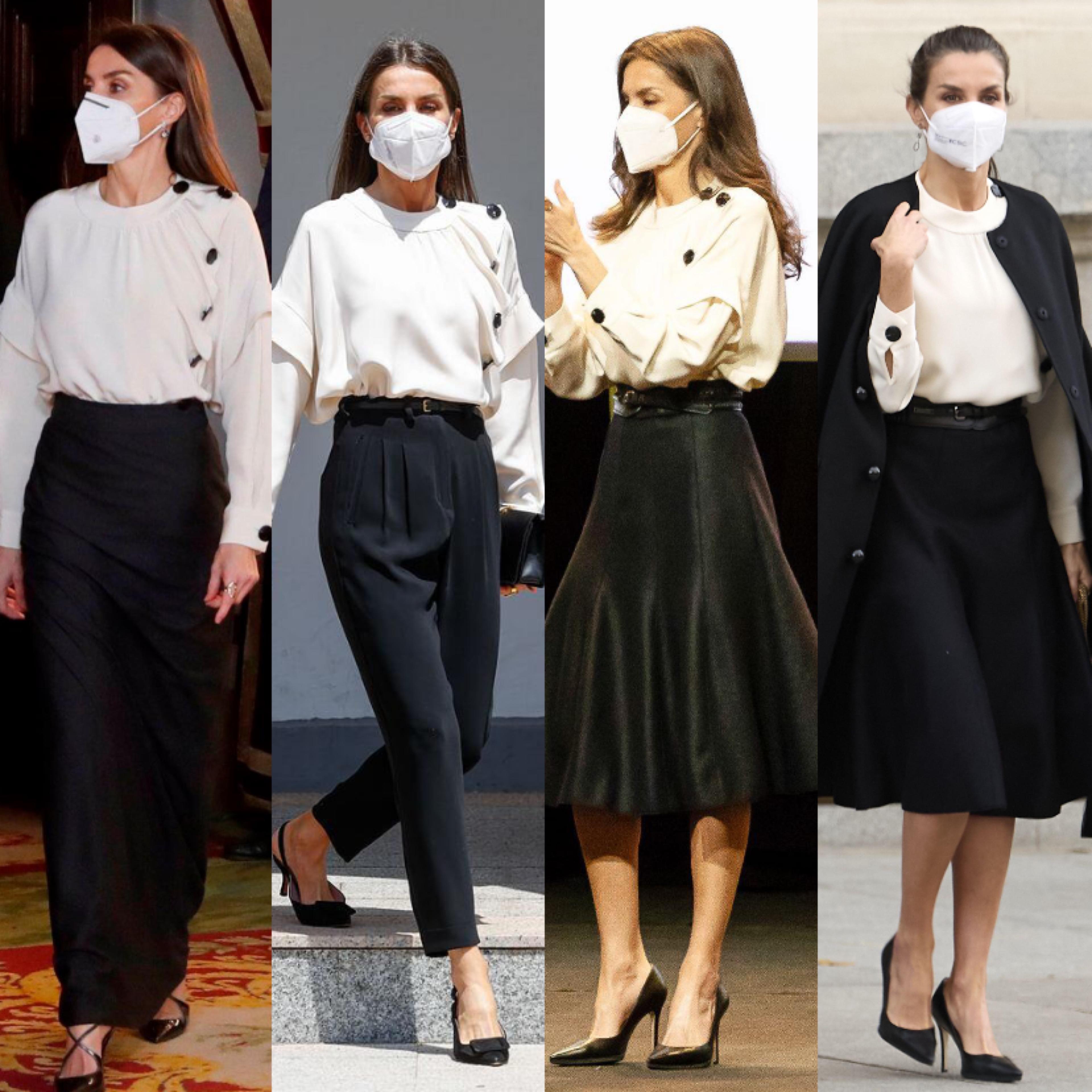 或許是女兒吃了第一口螃蟹反饋味道還不錯,2021年的開年活動中,萊蒂齊亞王后也入手了一件maksu的上衣,這是一件象牙色府綢面料的上衣,左側(cè)有黑色紐扣設(shè)計,有設(shè)計感卻并不花哨,她從入手至今,已經(jīng)穿過4次了,利用率高,搭配裙裝褲裝都可以,算得上衣櫥里的春秋百搭上衣。