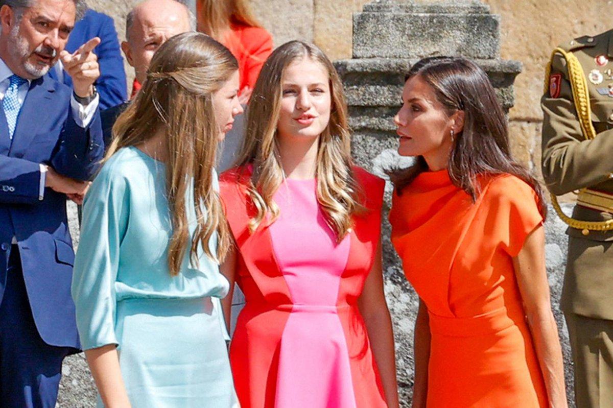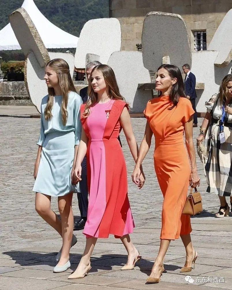 萊后在今年的圣地亞哥國祭儀式中,也選擇了他們家的橙色連衣裙,不規(guī)則領(lǐng)口和不規(guī)則腰身都是品牌特色,有一點“小性格”,卻又不背離優(yōu)雅底色,母女倆穿出來比例都很好。