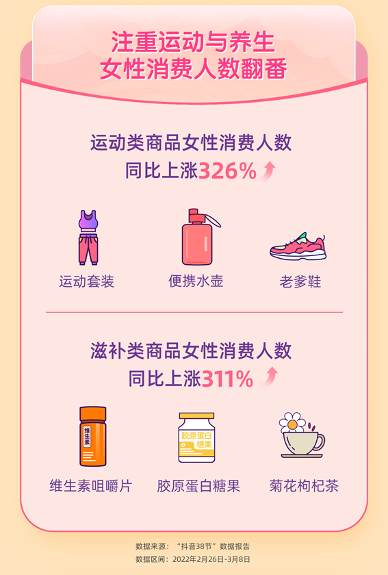 女性消費(fèi)者在“抖音38節(jié)”中體現(xiàn)出了品質(zhì)多元的購(gòu)物需求。據(jù)統(tǒng)計(jì),活動(dòng)期間運(yùn)動(dòng)和滋補(bǔ)類商品受到青睞,女性消費(fèi)人數(shù)同比分別上漲326%和311%。春日漸暖,不少女士選擇購(gòu)買運(yùn)動(dòng)套裝、便攜水壺和老爹鞋,出門鍛煉感受活力與生機(jī)。維生素咀嚼片、膠原蛋白糖果和菊花枸杞茶也成為她們的偏愛。