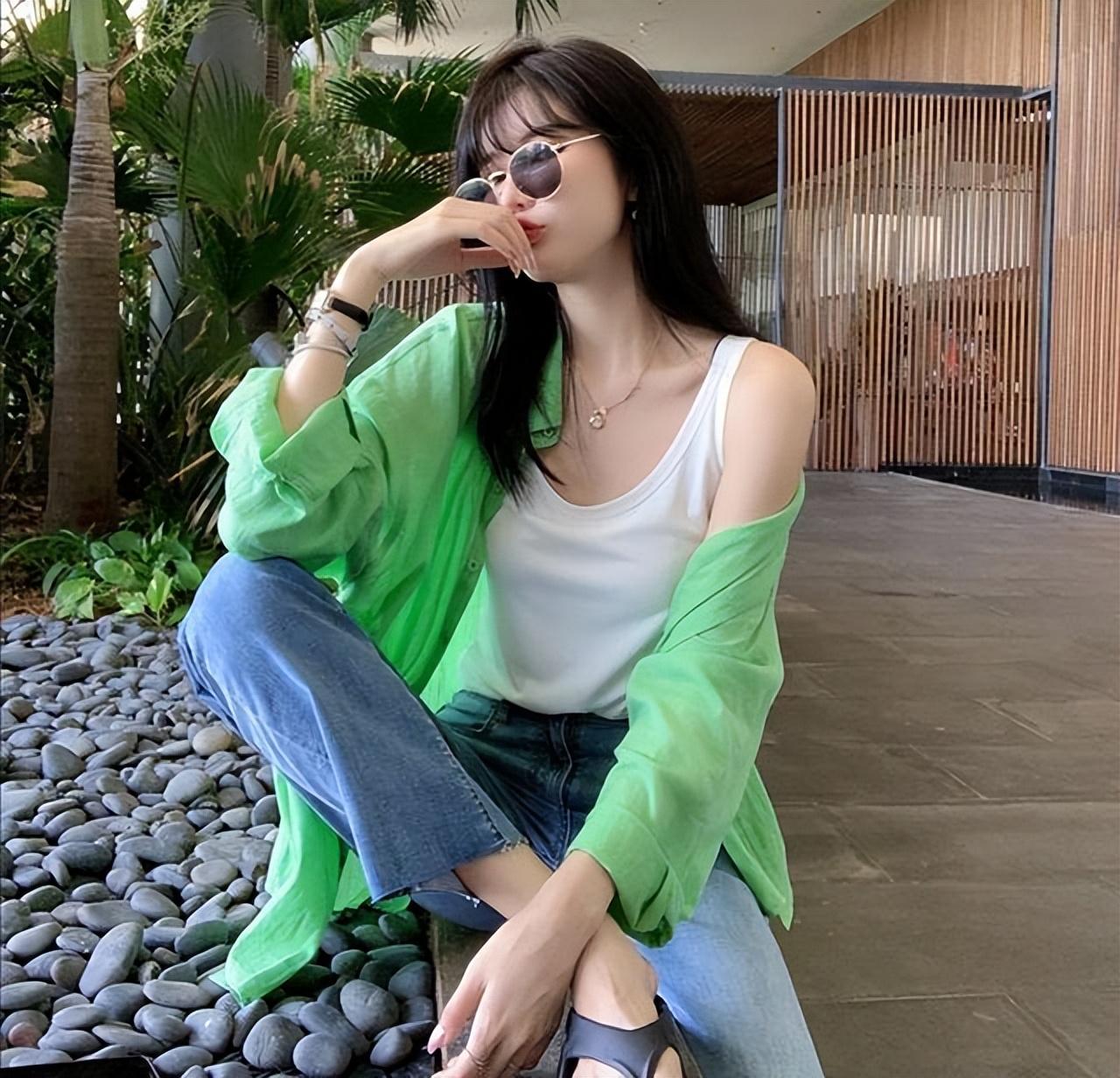 靚麗顏色的防曬衣可以搭配 一個白色的吊帶,外加牛仔長褲的加持,青春朝氣范十足了,出街就是靚麗的仔。