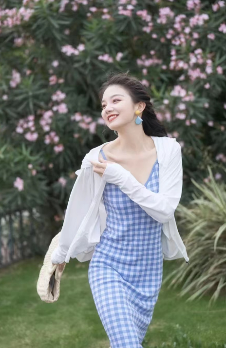 防曬和裙子搭配也是絕絕子,格紋的藍色裙子配上白色的防曬,真的的好看了,是不是很具有夏天氣息。