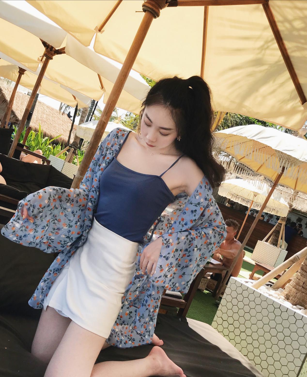 除了長裙外,短裙也是不錯的選擇,因為夏天炎熱,短裙配上小吊帶再來個碎花的防曬,有著很豐富的視覺看點了。