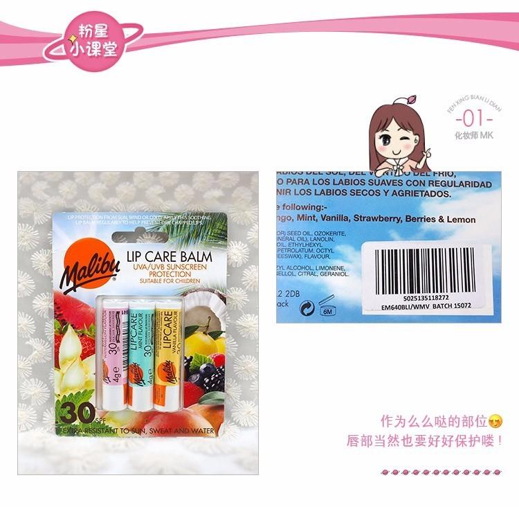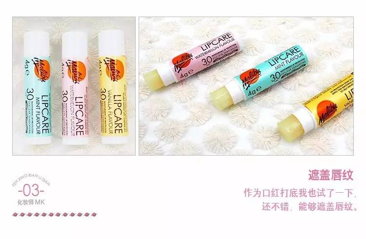 夏天防曬千萬被忽視了唇部的防曬,不然唇部色素沉淀涂什么唇膏都不好看!用一支帶有防曬功能的潤唇膏合適不過了~Malibu的高保濕防曬潤唇膏有西瓜、薄荷、香草三種味道,包裝走清新路線,香味也是淡淡的,比較天然。滋潤度挺不錯(cuò)的,喜歡它不會(huì)顯得油膩,特別適合作為口紅的打底。在成分上看,都天然和,號稱孕婦和小孩都能用~