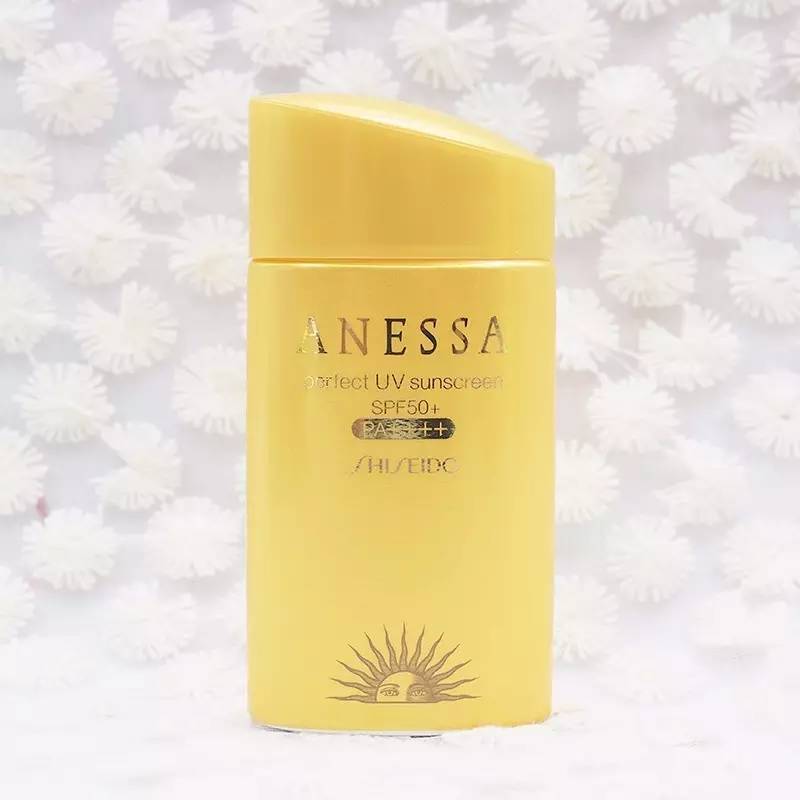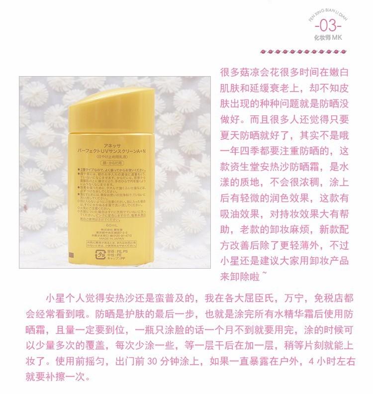 大名鼎鼎的資生堂安耐曬金瓶,因?yàn)椤鞍材蜁瘛闭直蝗嗽诖箨憪阂鈸屪⒘?,它只好換了名字“安熱沙”。這個(gè)防曬是粉星榜的第一名,用它,絕!對!曬!不!黑!這個(gè)防曬出門旅游、上山下海是必備的,紫外線輻射強(qiáng)的地方就更有必要使用高倍數(shù)防曬。這一款是含有酒精成分,日系里頭的很多防曬都有這個(gè)成分,因?yàn)榭梢詭椭罆窨焖俪赡?,對酒精敏感或者皮膚比較干的妹子不建議用這一款,皮膚偏油的妹子則推薦使用。