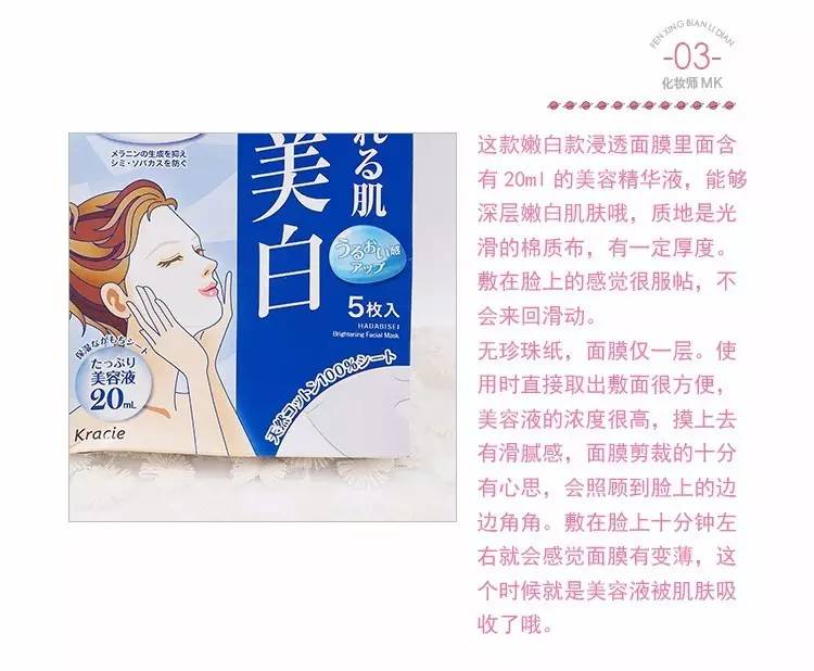 肌美精的面膜就不用多說了,范冰冰家里都是一箱一箱地囤著用的,MK之前去東京的時(shí)候掃了十幾盒回來,被辦公室的妹紙一掃而空。使用感受都是棒棒的,而且她們自己也在不斷回購。我自己也留了一盒,用了之后確實(shí)會(huì)有更有彈性,皮膚的透明感大大增強(qiáng)!這樣的皮膚,上個(gè)BB霜就很舒服啦~