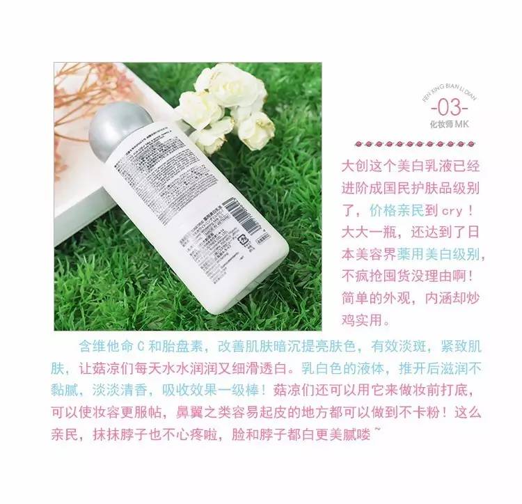 在粉星便利店里的美白乳液!這款乳液含有維C和胎盤素,十分保濕又美白!不少妹紙?jiān)谧鲎o(hù)膚的時(shí)候會(huì)忽略脖子和身體,導(dǎo)致色差嚴(yán)重。用大創(chuàng)來拯救脖子就是很不錯(cuò)的選擇!白菜又大碗,用起來一點(diǎn)都不心疼!(MK就是因?yàn)橛昧舜髣?chuàng)導(dǎo)致脖子比臉白也是醉...)