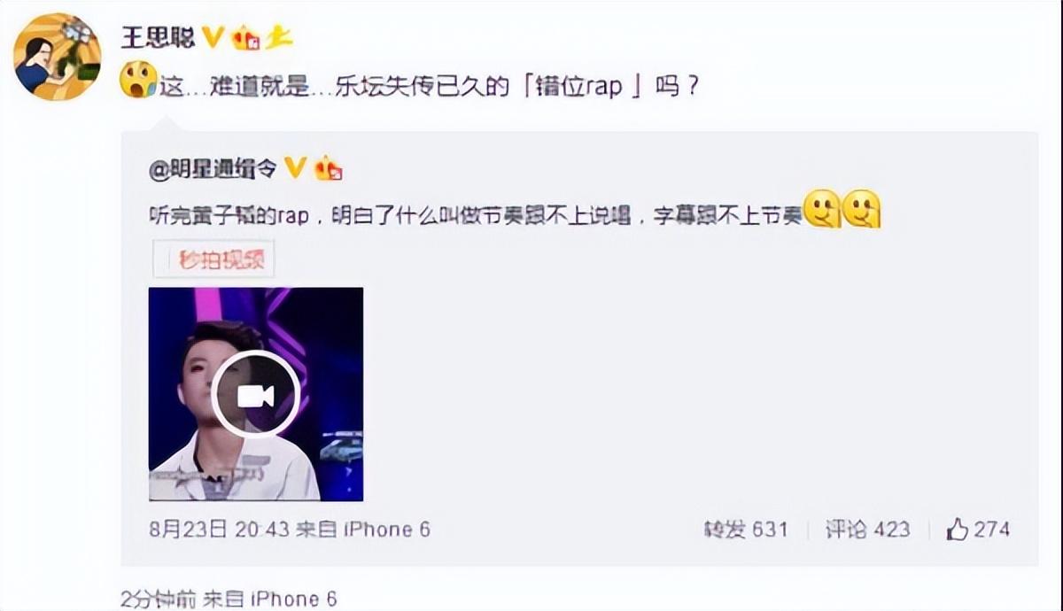 當媒體發(fā)布了黃子韜唱rap的視頻之后,王思聰評論這是樂壇失傳已久的錯位rap。