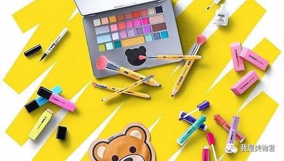 這次將彩妝品和化妝工具打造成了鉛筆、熒光筆、橡皮擦等文具,外加一臺筆記本電腦,在文具造型的“掩飾”下,實際有眼線筆、眼影盤、修容棒、化妝刷、化妝海綿等,Jeremy Scott 在顏色的運用上也頗為大膽,將鮮紅、湖藍(lán)、橘色、孔雀綠等鮮艷的顏色注入其中,彰顯個性。