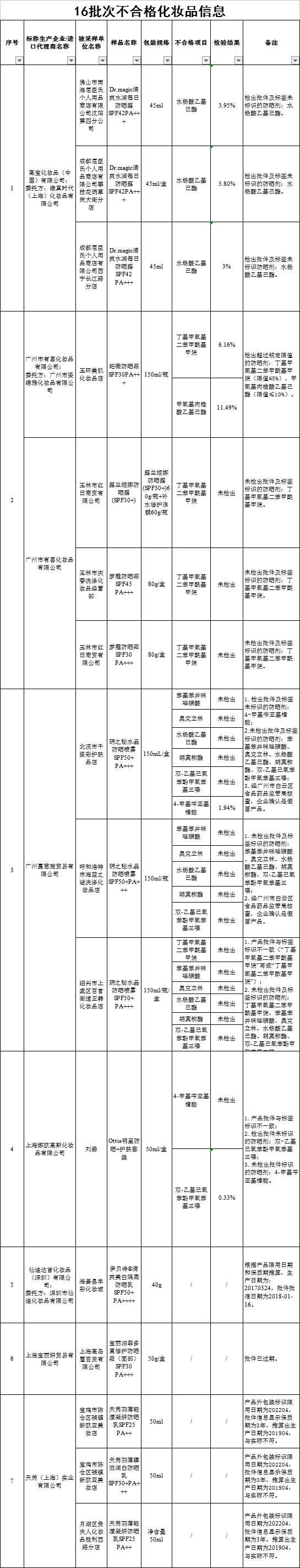 檢出超過規(guī)定限值的防曬劑:丁基甲氧基二苯甲?;淄?.16%(限值≤5%)、甲氧基肉桂酸乙基己酯11.49%(限值≤10%)