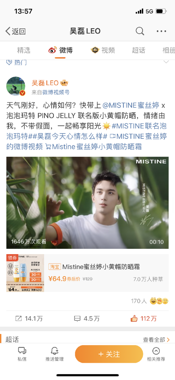 10月23日,Mistine蜜絲婷防曬代言人吳磊在微博官宣本次聯(lián)名事件,并發(fā)起#吳磊今天心情怎么樣#這一話題。截止發(fā)稿日,該話題共有2.7億閱讀次數(shù),討論次數(shù)達(dá)14.6萬(wàn)。