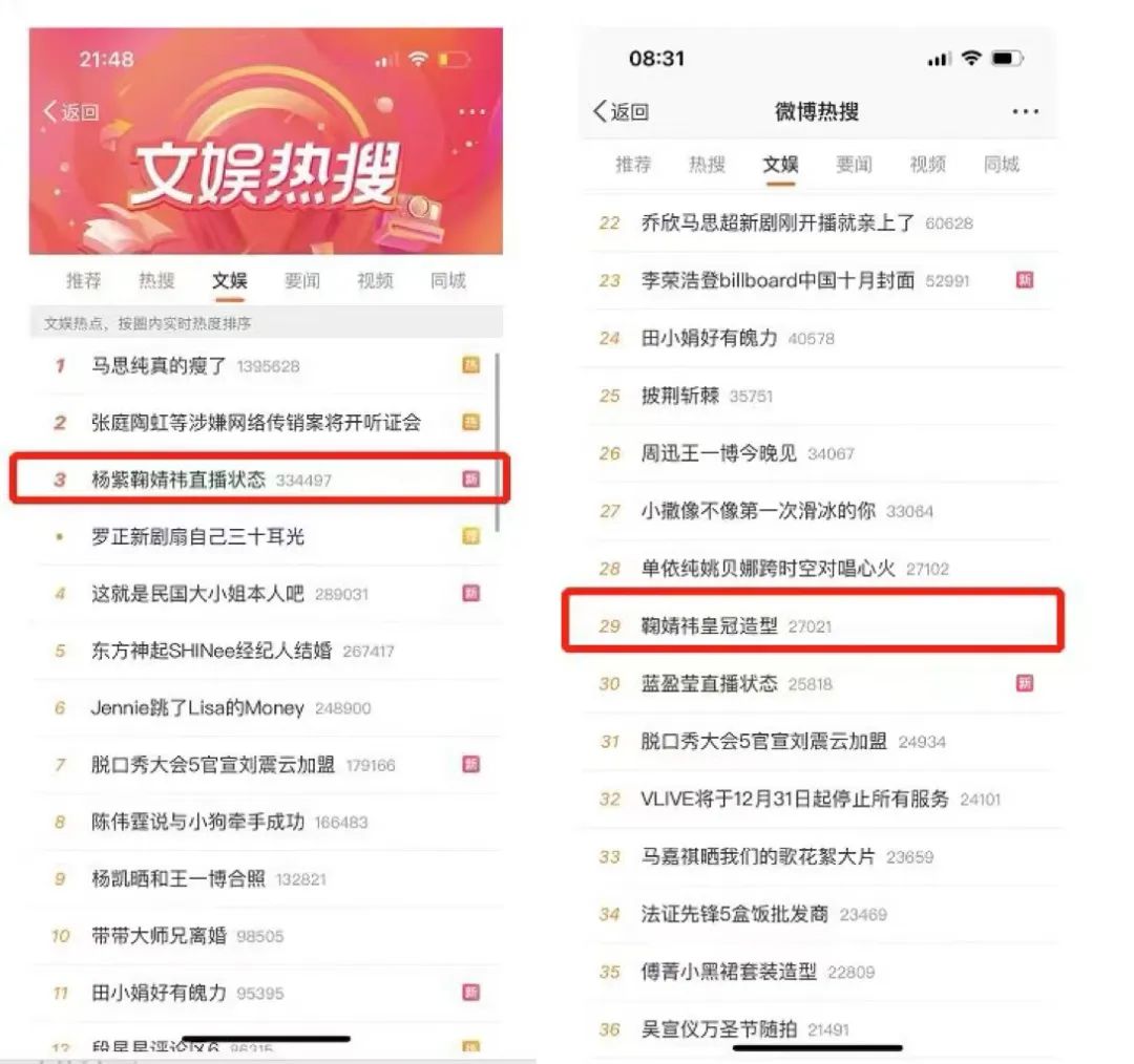 恰巧,10月31日是萬(wàn)圣節(jié),鞠婧祎在直播間展示了別具一格的“皇冠造型”,迅速破圈。11月1日和2日,鞠婧祎皇冠造型連續(xù)兩次登上微博熱搜,引發(fā)用戶熱烈討論和模仿,進(jìn)而帶來(lái)二次熱度爆發(fā)。