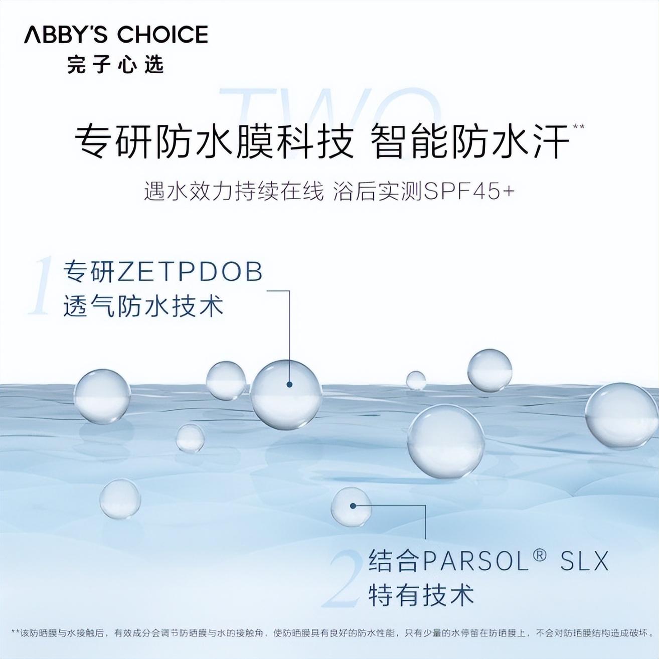 此外,全新ABBY’S CHOICE完子心選防曬小藍傘結(jié)合防曬原料特有技術(shù)PARSOL SLX,牢牢鎖住化學(xué)防曬劑,防止其滲入皮膚,損傷肌膚屏障。且質(zhì)地水潤,一抹成膜,肌膚輕盈清爽無負擔(dān)。