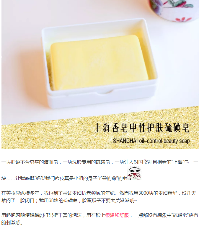 國(guó)貨中經(jīng)典,去除螨蟲,祛痘痘,注意不同款身體用和臉部不一樣,黃色塊狀固體,有硫磺氣味。小蠻也推薦過(guò)。