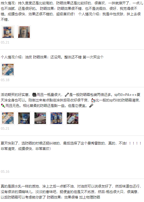 深扒過后發(fā)現(xiàn)我們的宋妍霏女神也說(shuō)她自用三年了,她說(shuō)她的防曬需求就是膚感一定要好,畢竟是每天都要用的東西嘛。這款防曬霜是她的心頭好了,只要擠出一塊硬幣的大小就能涂完全臉,而且是0添加的適用任何膚質(zhì)?,F(xiàn)在夏天用了也不會(huì)增加皮膚負(fù)擔(dān),不用擔(dān)心會(huì)出油悶痘哦,方便易攜帶,現(xiàn)在是她化妝包必備呢。