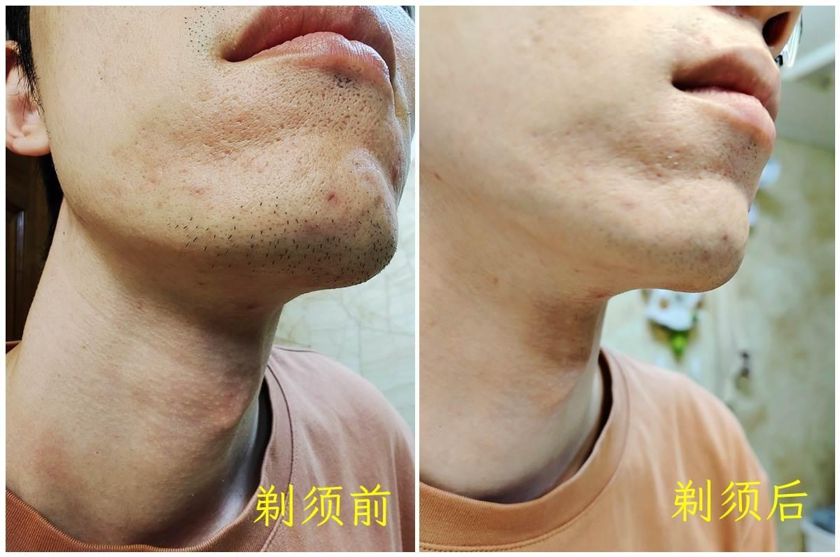 具體我們來看看剃須的實(shí)際果。如下圖所示,左邊為剃須前的實(shí)拍圖,可以看到,才1天沒刮胡子,下巴上已經(jīng)有的胡渣感了,但在用這款剃須刀簡單操作了幾下后,馬上就剃干凈了。