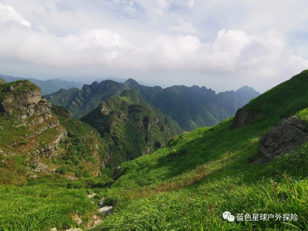 落日峰至高嶂頂,一路視野開(kāi)闊:踏過(guò)的群山全在腳下,一覽眾山小,綠色的大草坡,像一幅美麗的巨大畫(huà)卷,跳躍在藍(lán)天白云下,不注意還以為來(lái)到了某個(gè)大草原。