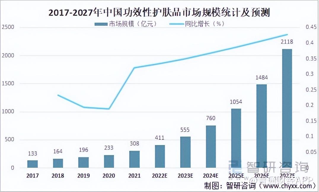 沙利文數(shù)據(jù)表明,2021年中國(guó)功性護(hù)膚品市場(chǎng)規(guī)模達(dá)308億元,較2020年增加了75億元,同比增長(zhǎng)32.19%,未來(lái)將繼續(xù)保持增長(zhǎng),預(yù)計(jì)2027年中國(guó)功性護(hù)膚品市場(chǎng)規(guī)模將達(dá)到2118億元。
