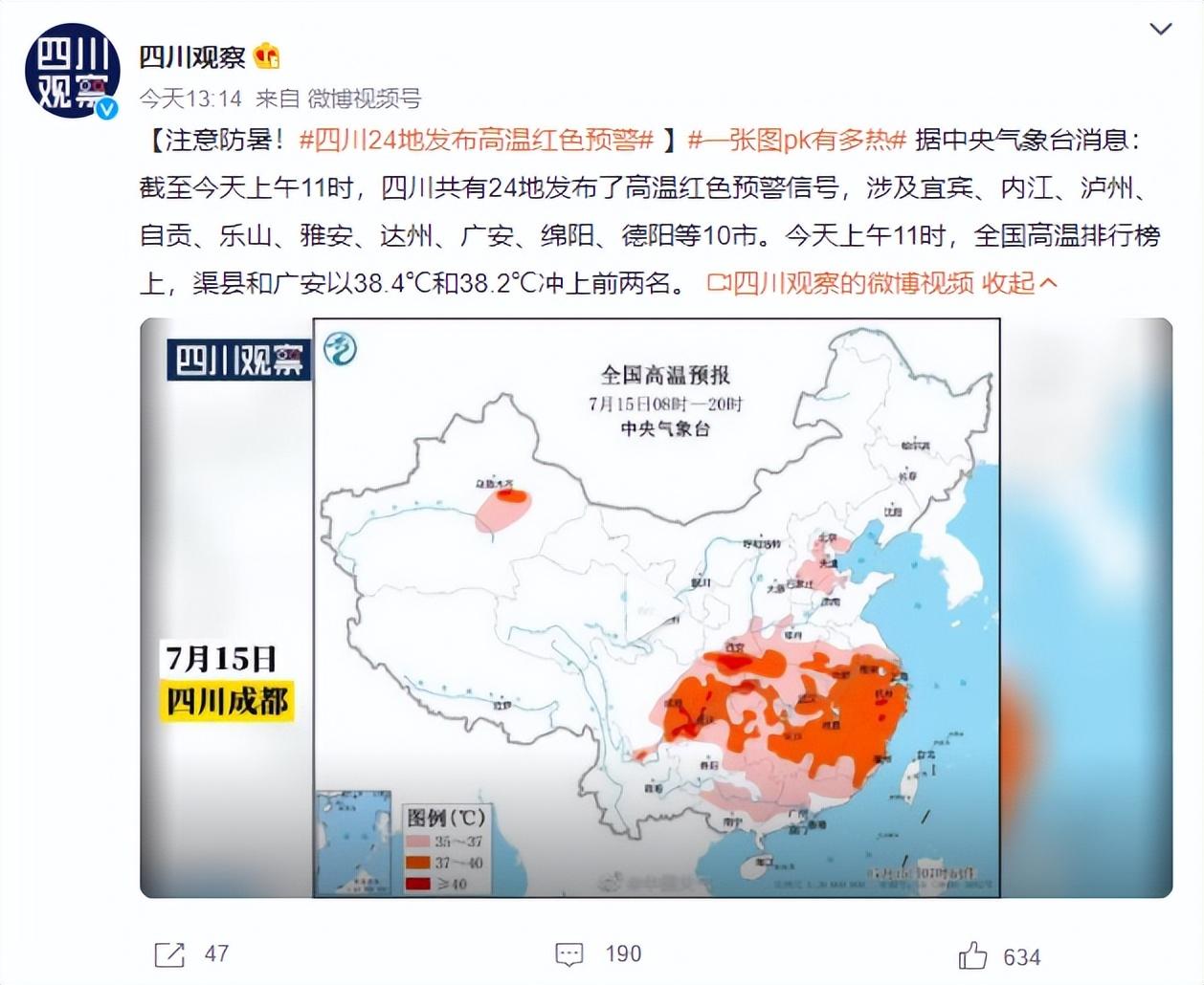 根據(jù)中央氣象臺(tái)的數(shù)據(jù)顯示,截至7月15日上午11點(diǎn),四川一共有24個(gè)地發(fā)布了高溫紅色預(yù)警信號(hào),涉及了宜賓、內(nèi)江、瀘州、自貢、樂(lè)山、雅安、達(dá)州、廣安、綿陽(yáng)、德陽(yáng)等10個(gè)城市。