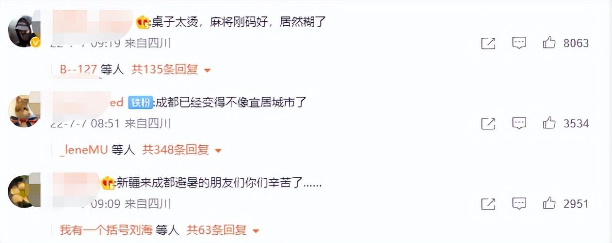 不過(guò)就算溫度再高,也阻止不了四川網(wǎng)友的樂(lè)觀天性。有四川網(wǎng)友自我調(diào)侃道:“我不開(kāi)玩笑的說(shuō),昨條在外面拌了一份涼菜,提回去感覺(jué)吃的是冒菜”、“桌子太燙,麻將剛碼好,居然糊了”、“新疆來(lái)成都避暑的朋友們你們辛苦了……”