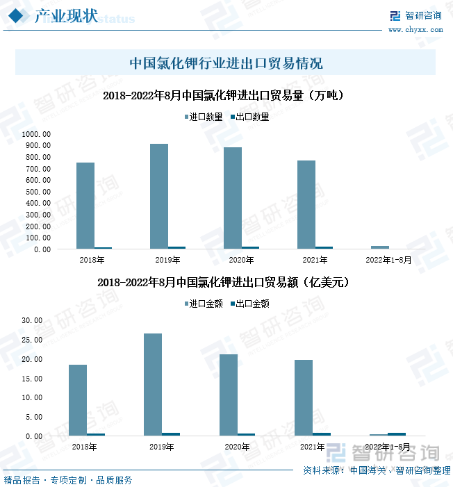 我國氯化鉀進(jìn)口貿(mào)易規(guī)模遠(yuǎn)高于出口貿(mào)易規(guī)模。2021年,國內(nèi)氯化鉀產(chǎn)品進(jìn)出口貿(mào)易量分別為767.35萬噸、22.92萬噸,同比變化率分別為-13.09%、0.64%;進(jìn)出口貿(mào)易金額分別為19.72億美元、0.77億美元,同比變化率分別為-6.77%、5.74%。由于國際市場氯化鉀產(chǎn)品供應(yīng)偏緊,國內(nèi)進(jìn)口價格大幅增長,我國氯化鉀進(jìn)口規(guī)模有較大波動。2022年1-8月,我國氯化鉀產(chǎn)品進(jìn)出口貿(mào)易量分別為555.01萬噸、0.82萬噸,同比變化率分別為0.47%、-96.02%;進(jìn)出口貿(mào)易金額分別為28.06億美元、0.07億美元,同比變化率分別為111.45%、-89.30%。我國氯化鉀產(chǎn)品進(jìn)口價格持續(xù)保持增長態(tài)勢。