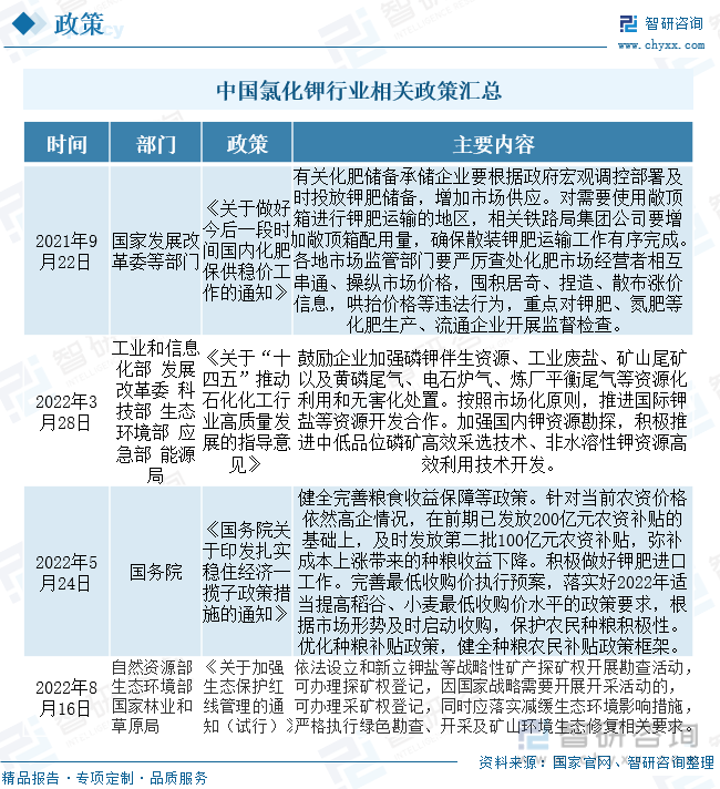 有關(guān)部門頒布的《關(guān)于加強生態(tài)保護紅線管理的通知(試行)》《關(guān)于“十四五”推動石化化工行業(yè)高質(zhì)量發(fā)展的指導(dǎo)意見》《關(guān)于做好今后一段時間國內(nèi)化肥保供穩(wěn)價工作的通知》等政策指出,我國要加緊鉀鹽等戰(zhàn)略性礦產(chǎn)探礦勘查活動開展,同時要積極推進(jìn)非水溶性鉀資源高利用技術(shù)研究開發(fā),鼓勵企業(yè)加強磷鉀伴生資源等資源化利用及無害化處置,推進(jìn)國際鉀鹽等資源開發(fā)合作,按市場情況,適時適量改變國內(nèi)氯化鉀等產(chǎn)品儲備,穩(wěn)定國內(nèi)市場供應(yīng),加大行業(yè)市場運行監(jiān)管力度。