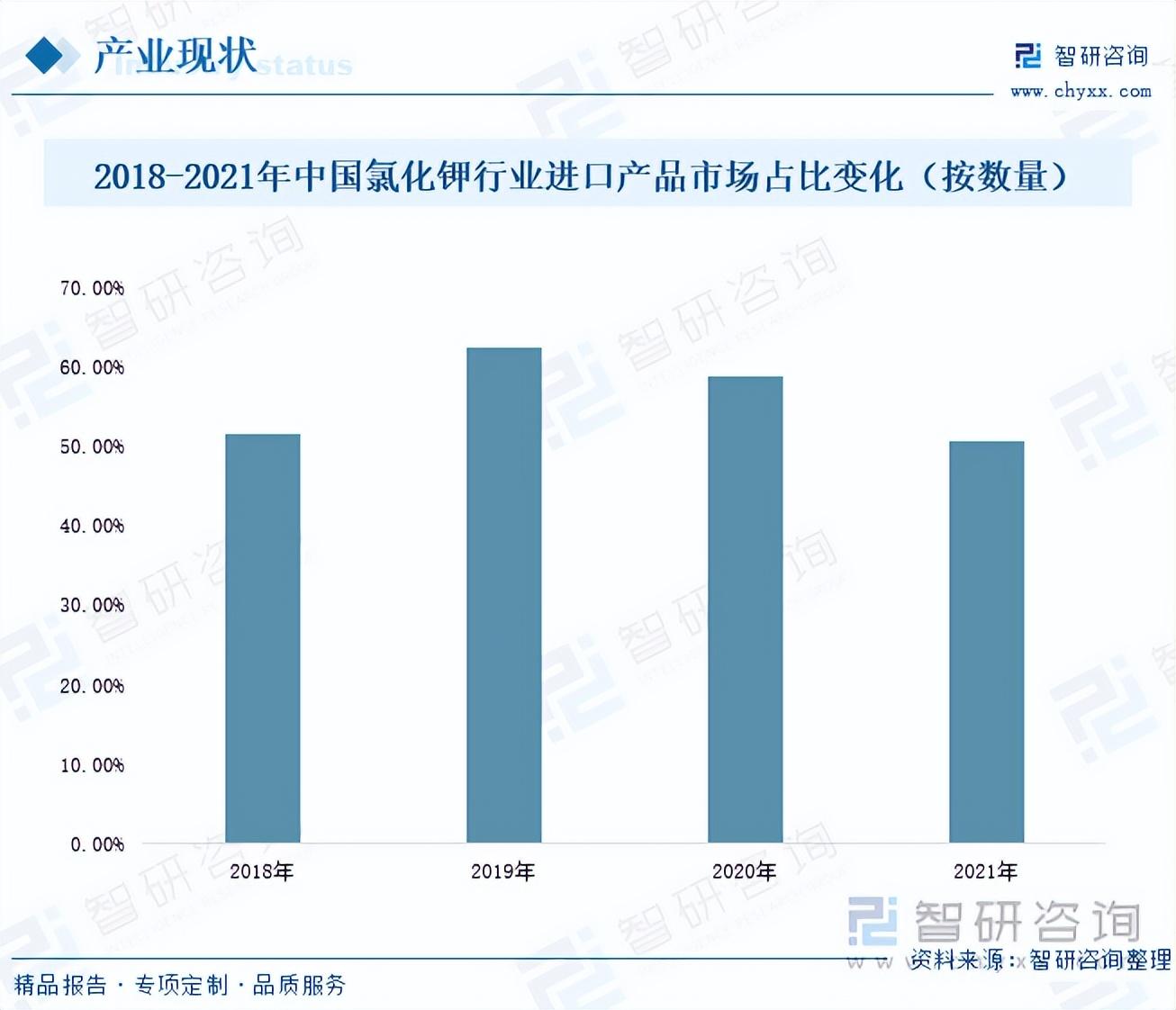 據(jù)鉀堿儲量分布情況看,我國鉀堿儲量僅占儲量10%左右,其次,國內(nèi)鉀資源賦能品味較低且行業(yè)生產(chǎn)提取技術(shù)水平不足,因此,即使我國氯化鉀行業(yè)資源開采力度持續(xù)增強,國內(nèi)行業(yè)產(chǎn)量仍無法滿足市場消費需求,我國氯化鉀行業(yè)進(jìn)口產(chǎn)品總量占市場比例高達(dá)50%以上,行業(yè)市場供給高度依賴于進(jìn)口貿(mào)易。
