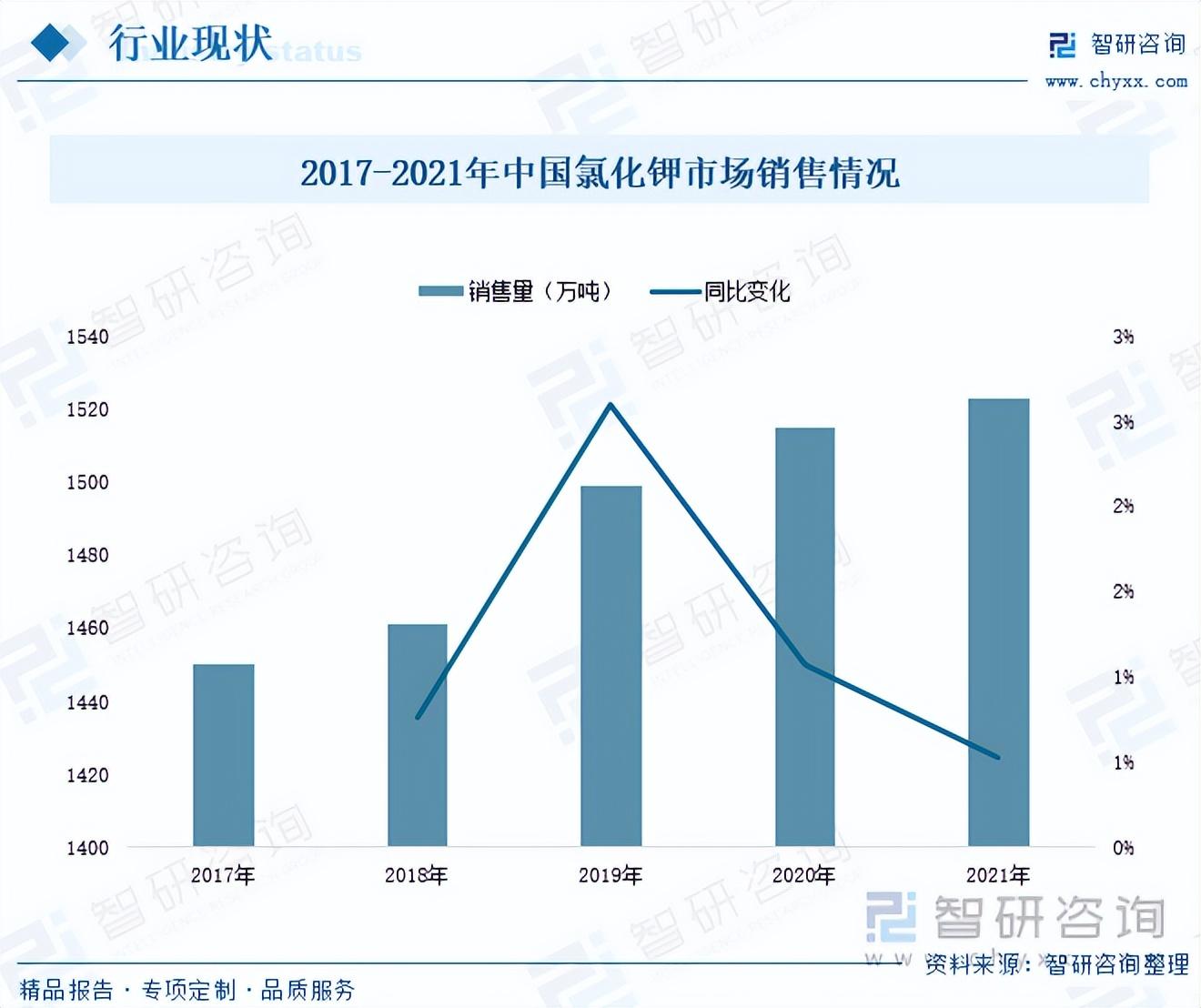 2017-2021年,由于下游市場消費需求持續(xù)提升,我國氯化鉀產(chǎn)品市場銷量逐年增長。2021年,國內(nèi)氯化鉀產(chǎn)品市場銷量達(dá)1523萬噸,同比增長0.53%;行業(yè)產(chǎn)品消費量保持增長態(tài)勢但增速開始趨于平緩。