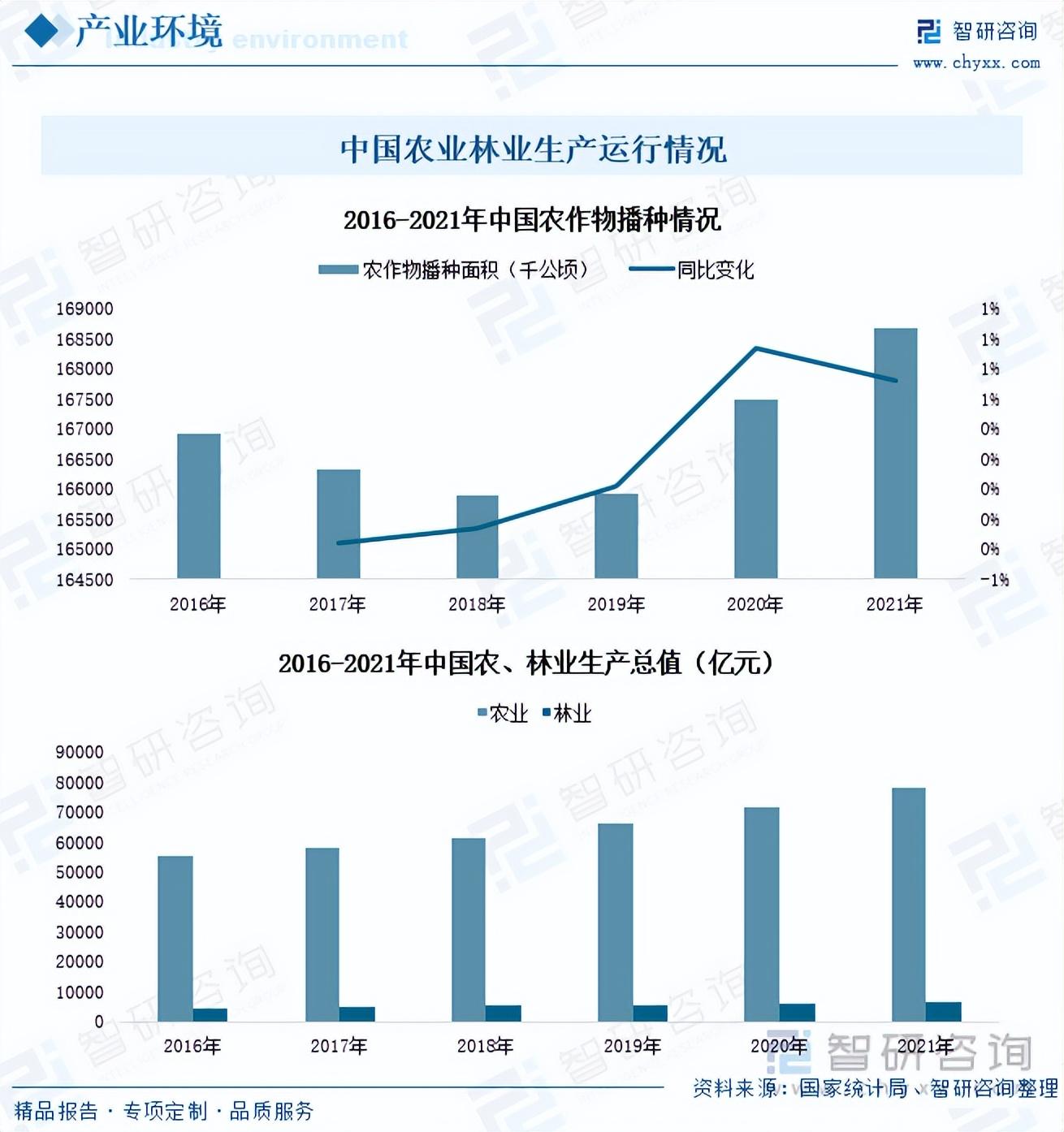 有關(guān)部門頒布的《關(guān)于“十四五”推動石化化工行業(yè)高質(zhì)量發(fā)展的指導(dǎo)意見》《關(guān)于做好今后一段時間國內(nèi)化肥保供穩(wěn)價工作的通知》等政策指出,我國要加緊鉀鹽等戰(zhàn)略性礦產(chǎn)探礦勘查活動開展,同時要積極推進(jìn)非水溶性鉀資源高利用技術(shù)研究開發(fā),鼓勵企業(yè)加強磷鉀伴生資源等資源化利用及無害化處置,推進(jìn)國際鉀鹽等資源開發(fā)合作,按市場情況,適時適量改變國內(nèi)氯化鉀等產(chǎn)品儲備,穩(wěn)定國內(nèi)市場供應(yīng)。2016年-2021年,國內(nèi)農(nóng)業(yè)播種面積呈現(xiàn)穩(wěn)中小增態(tài)勢,產(chǎn)業(yè)經(jīng)濟運行呈現(xiàn)持續(xù)增長態(tài)勢。2021年,我國農(nóng)作物播種面積達(dá)168695.13千公頃,同比增長0.72%;農(nóng)業(yè)生產(chǎn)總值達(dá)78339.51億元,同比增長9.19%;林業(yè)經(jīng)濟生產(chǎn)總值達(dá)6507.7億元,同比增長9.16%。我國農(nóng)業(yè)、林業(yè)經(jīng)濟運行穩(wěn)定且呈上升態(tài)勢,市場氯化鉀等鉀肥產(chǎn)品需求規(guī)模保持增長。