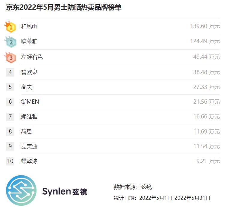 根據(jù)電商數(shù)據(jù)搜索工具——“弦鏡”數(shù)據(jù)顯示,京東平臺(tái)2022年5月男士防曬熱賣品牌榜單,第一名和風(fēng)雨,銷售額為139.60萬(wàn)元。第二名歐萊雅,銷售額為124.49萬(wàn)元。第三名左顏右色,銷售額為49.44萬(wàn)元。從第四名到第十名分別為碧歐泉、高夫、御MEN、妮維雅、赫恩、麥芙迪、蝶翠詩(shī)。