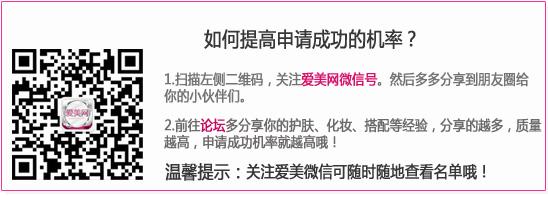 掃描右側(cè)二維碼關(guān)注愛美網(wǎng)微信,每周六查看新試用信息與中獎(jiǎng)名單。