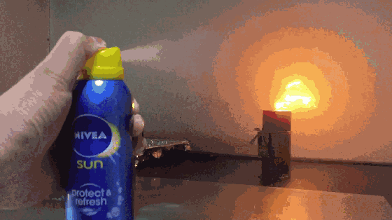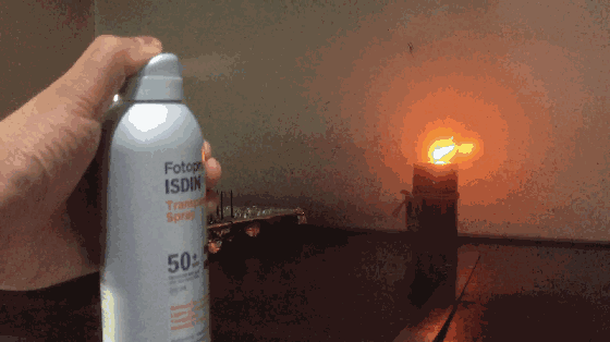 ▲出現(xiàn)火焰的防曬噴霧實(shí)拍