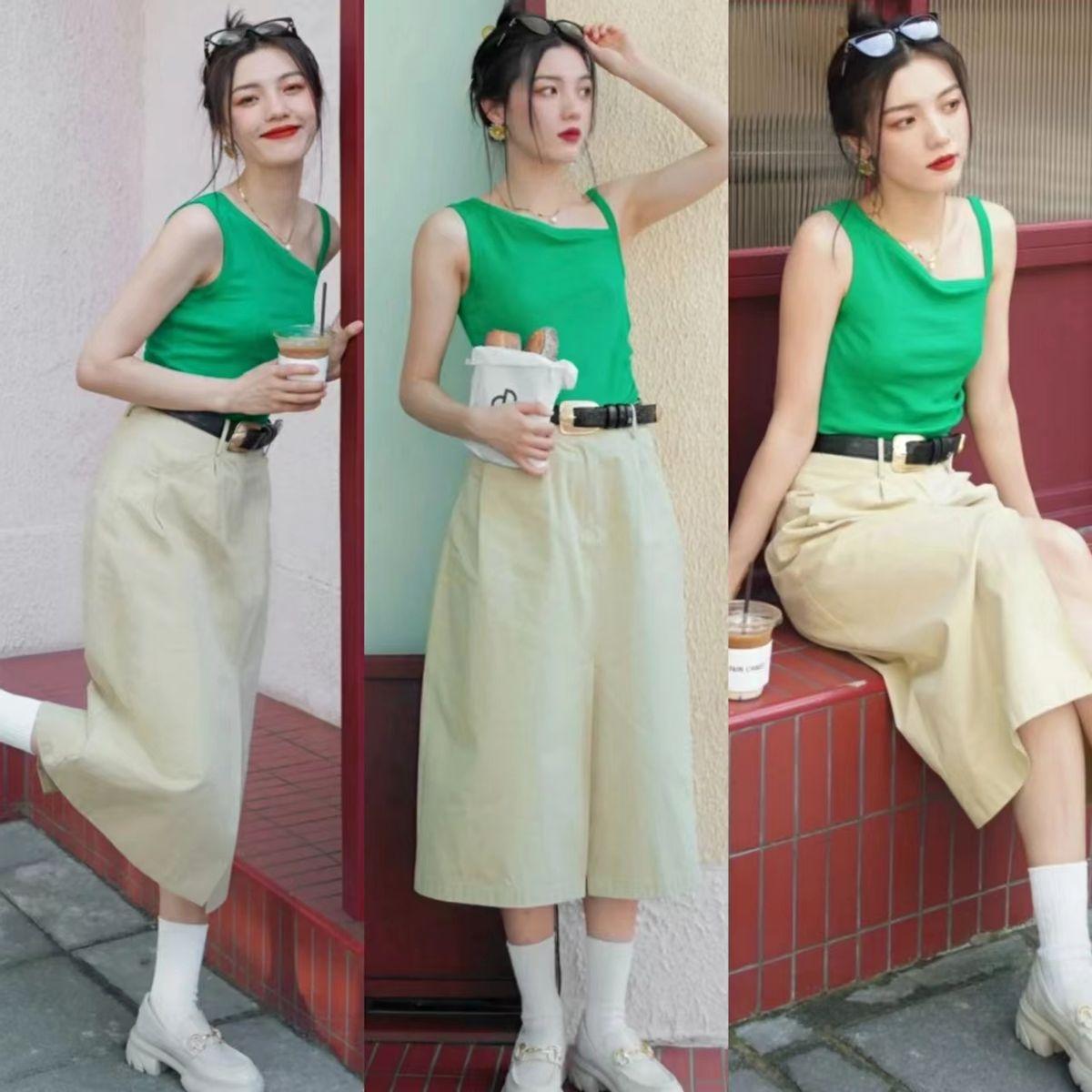 綠色吊帶衫+半身長裙夏天需要活力繽紛的色彩,也需要穿得清涼舒適。在這一前提要求下,也是可以稍微地兼顧住精致感與感。一件綠色的吊帶衫搭配一條淺咖色系的半身長裙,清爽干凈又不失優(yōu)雅感。