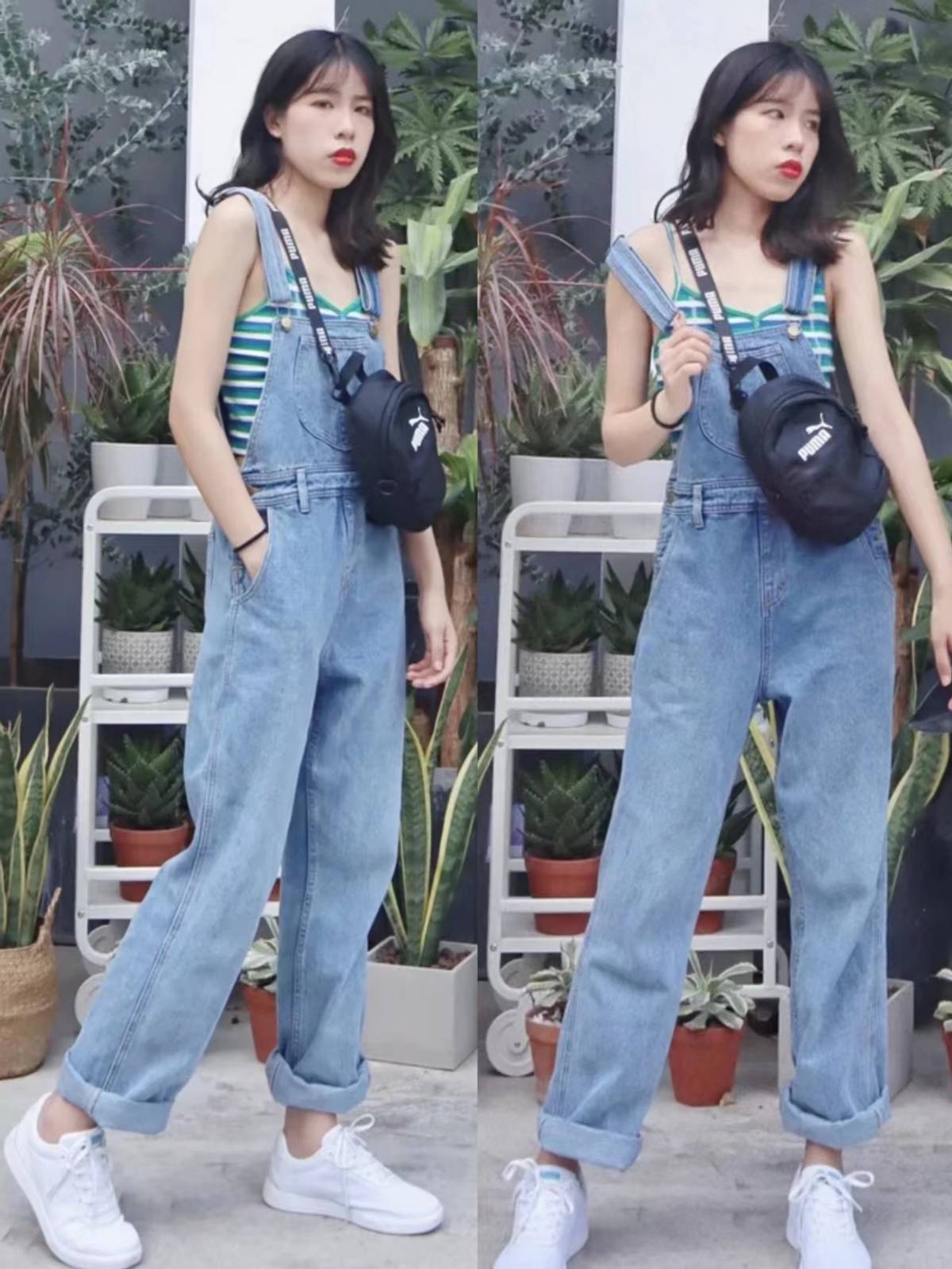 薄荷綠拼接條紋衫+牛仔背帶褲穿一件薄荷綠的拼接條紋衫,清新又簡約、降溫又降噪。外搭牛仔背帶長褲,可可愛愛的樣子。