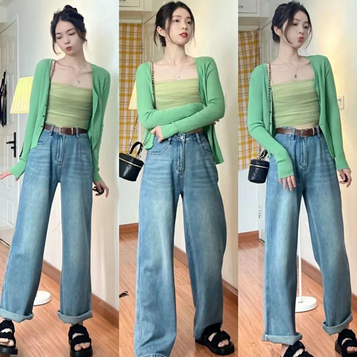 綠色吊帶+綠色開衫+牛仔褲綠色的吊帶衫外搭一件綠色小開衫,同色系搭配方式簡約又高級(jí),不同深淺的綠色也是可以碰撞出層次感,更具韻味。采用“上緊下松”的搭配方式,褲裝搭配一條寬松版的牛仔褲。
