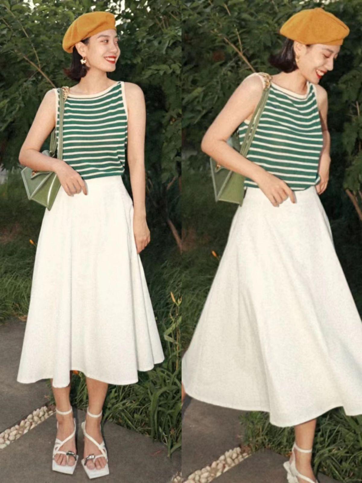 綠條紋吊帶衫+ 白色傘裙清新自然的綠白配色,運(yùn)用在夏日時(shí)節(jié)的穿搭上,那就是讓我們一整個(gè)人被清爽干凈的氛圍包圍住。穿一件綠色的條紋吊帶衫搭配白色的傘裙,優(yōu)雅又大方。