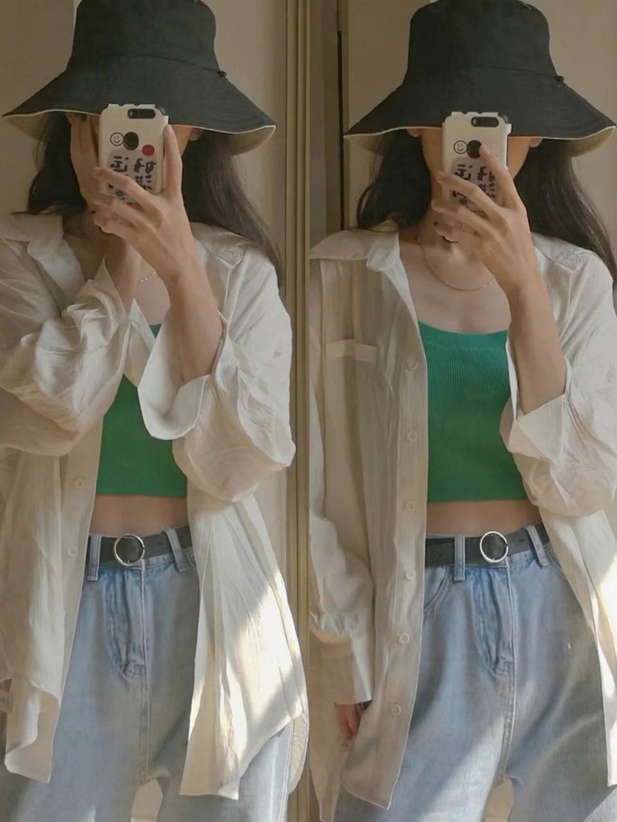 樹綠色吊帶+馬卡龍色防曬襯衫+淺藍(lán)色牛仔褲薄款的防曬襯衫內(nèi)搭數(shù)綠色的吊帶衫,寬寬大大又材質(zhì)輕盈的防曬衫,穿出了一股隨性自在又輕松舒適的樣子。里面是綠色的小吊帶,也具有一定的個(gè)性感和吸睛度。