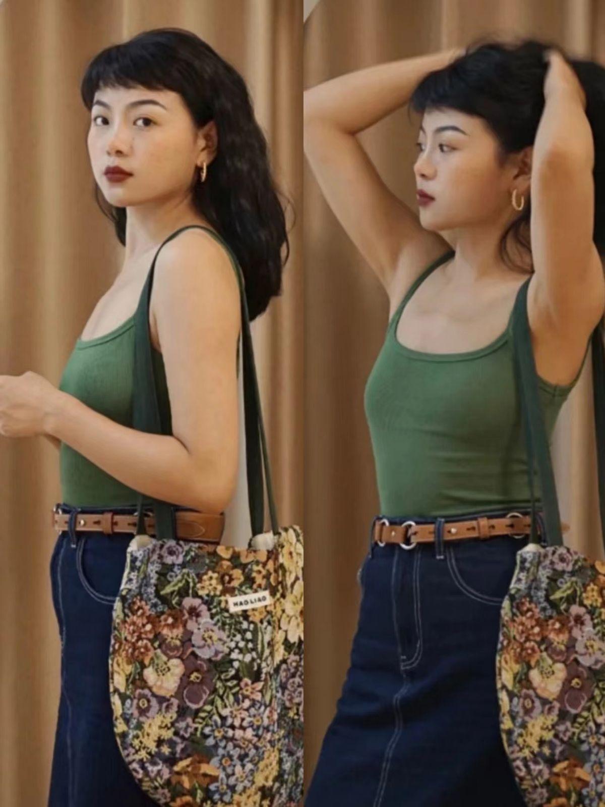 深綠色吊帶衫+牛仔長裙帶有一點(diǎn)暗調(diào)、深綠色的吊帶衫,穿上后很具復(fù)古感。簡單地搭配上一條深色系的長款牛仔裙,搭配在一起就很具復(fù)古時(shí)髦感,優(yōu)雅又大氣。在裙裝上系上一根棕色的皮腰帶。