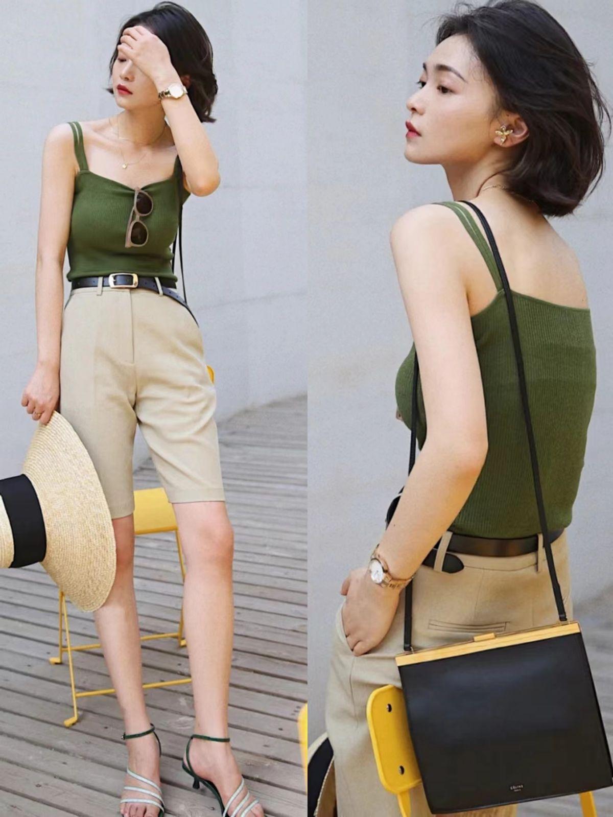深綠色吊帶+西裝短褲穿一件深綠色的吊帶衫,顯膚白的同時(shí)又很隨性優(yōu)雅。搭配一條寬松版的西裝中褲,舒適又透氣,更添隨性大氣感。