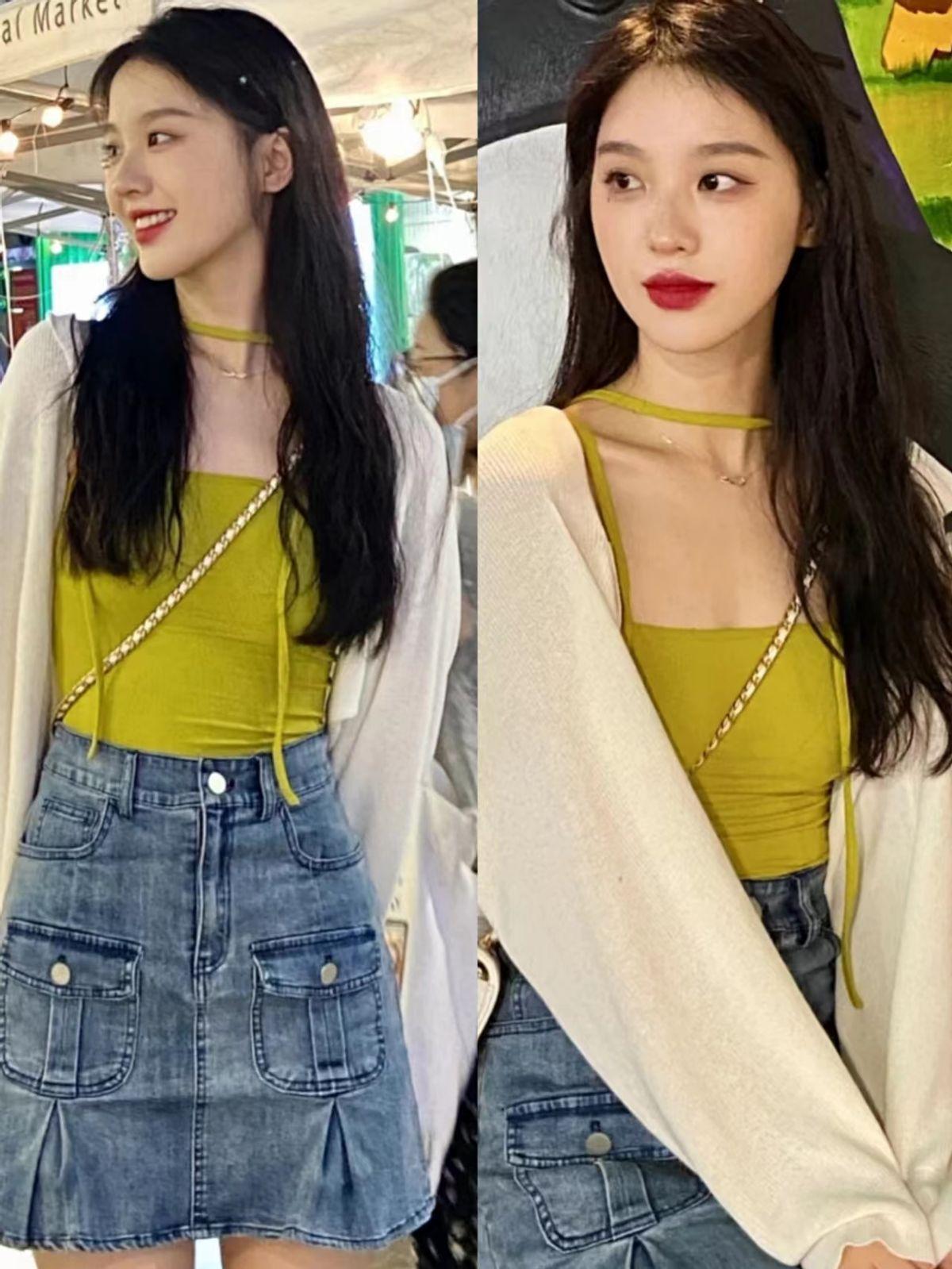 綠色吊帶+白色開衫+牛仔裙綠色的小吊帶外搭白色的開衫,清新甜美又少女感十足。搭配一條短款的牛仔裙,將吊帶衫扎進(jìn)小裙子里,顯腰身的同時(shí)。