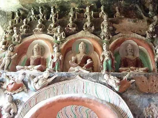 麥積山的形狀很奇特,孤峰突起,猶如麥垛。那陡崖峻壁上開鑿而成的成百上千蜂窩似的洞窟和安坐的佛像給人帶來強烈的視覺沖擊,讓人難以忘記。