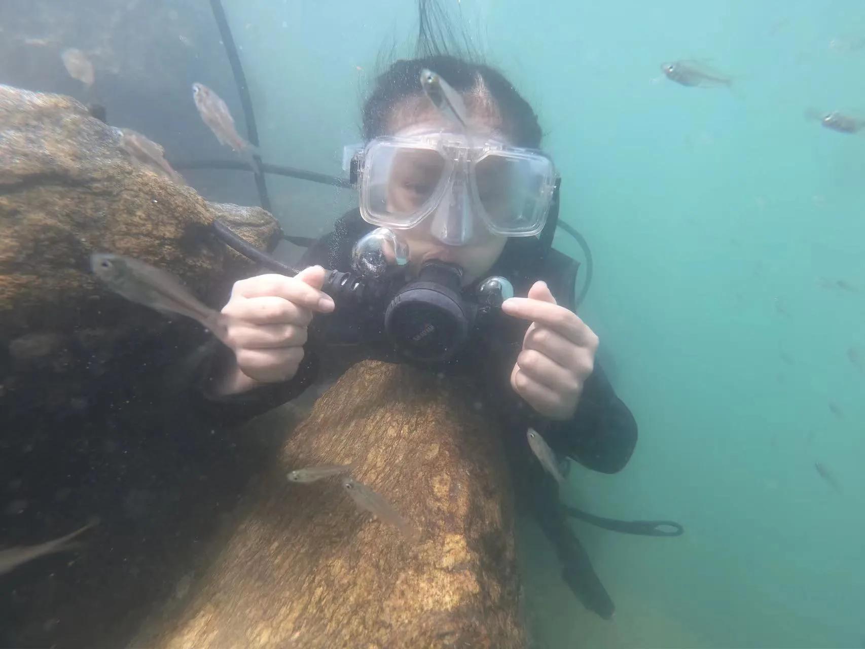 茶足飯飽后姐妹兩人直奔這次上島的主要目的地——潛水基地,客服拿出一張價(jià)格表,不同潛水項(xiàng)目?jī)r(jià)格各不相同,從120到998都有。因?yàn)榕_(tái)風(fēng)剛剛過(guò)境,姐姐向往的外海深水潛項(xiàng)目暫時(shí)沒(méi)有開(kāi)放,客服推薦398元的一種項(xiàng)目。教練細(xì)心又耐心,有經(jīng)驗(yàn)。小女兒年齡小,手動(dòng)排壓失敗,教練就帶著她潛淺水,體驗(yàn)喂魚(yú)捉魚(yú)。大女兒膽大,教練就帶著她深潛去看珊瑚,海水能見(jiàn)度超高,不愧有東方夏威夷之稱。